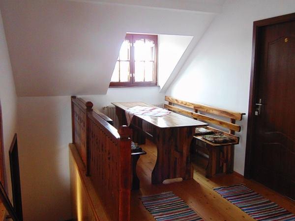 A panzió középső részén található a régi csűrkapu, amely egy tágas fogadóteret nyit meg, melynek meghosszabbításában egy modern ebédlő kapott helyet, hagyományos kalotaszegi díszítéssel.